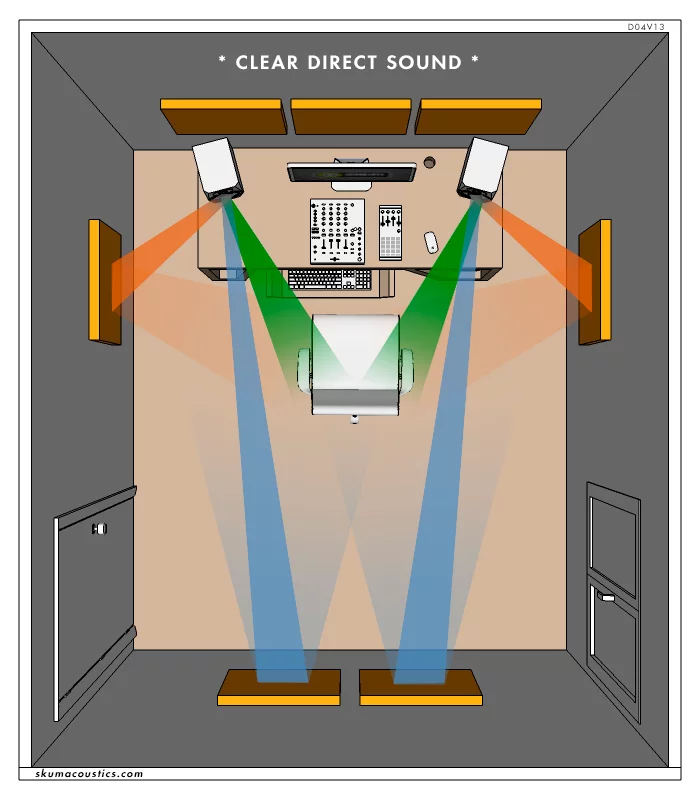 Los paneles absorbentes reducen la reverberación y mejoran la claridad del sonido. Deben ubicarse en: