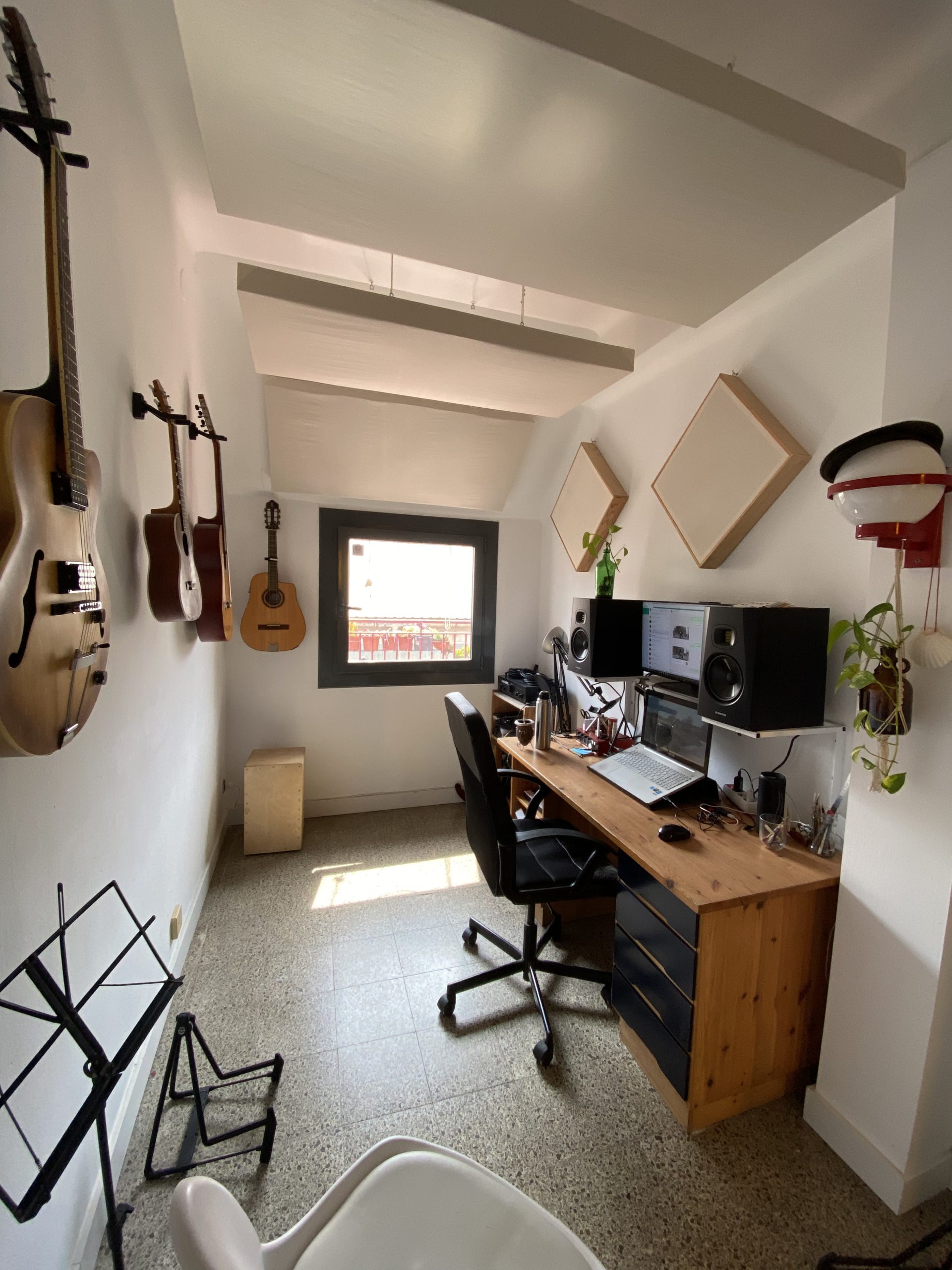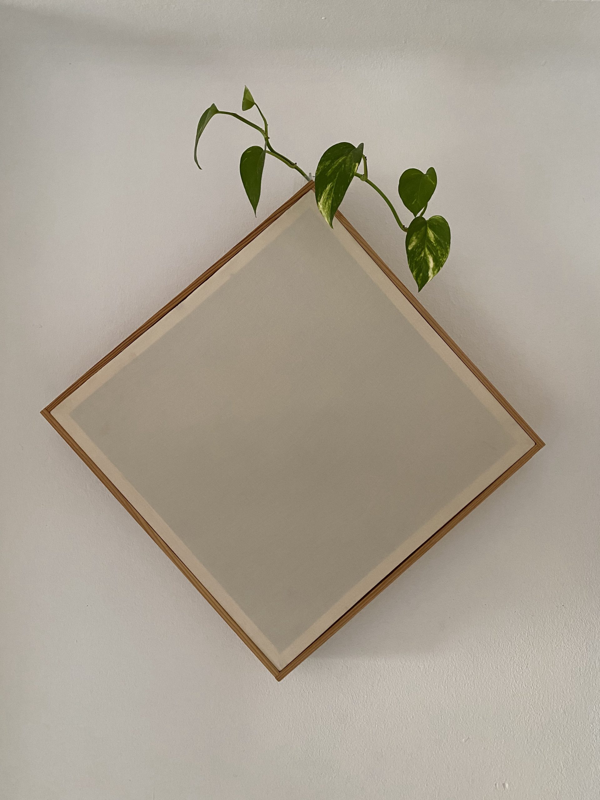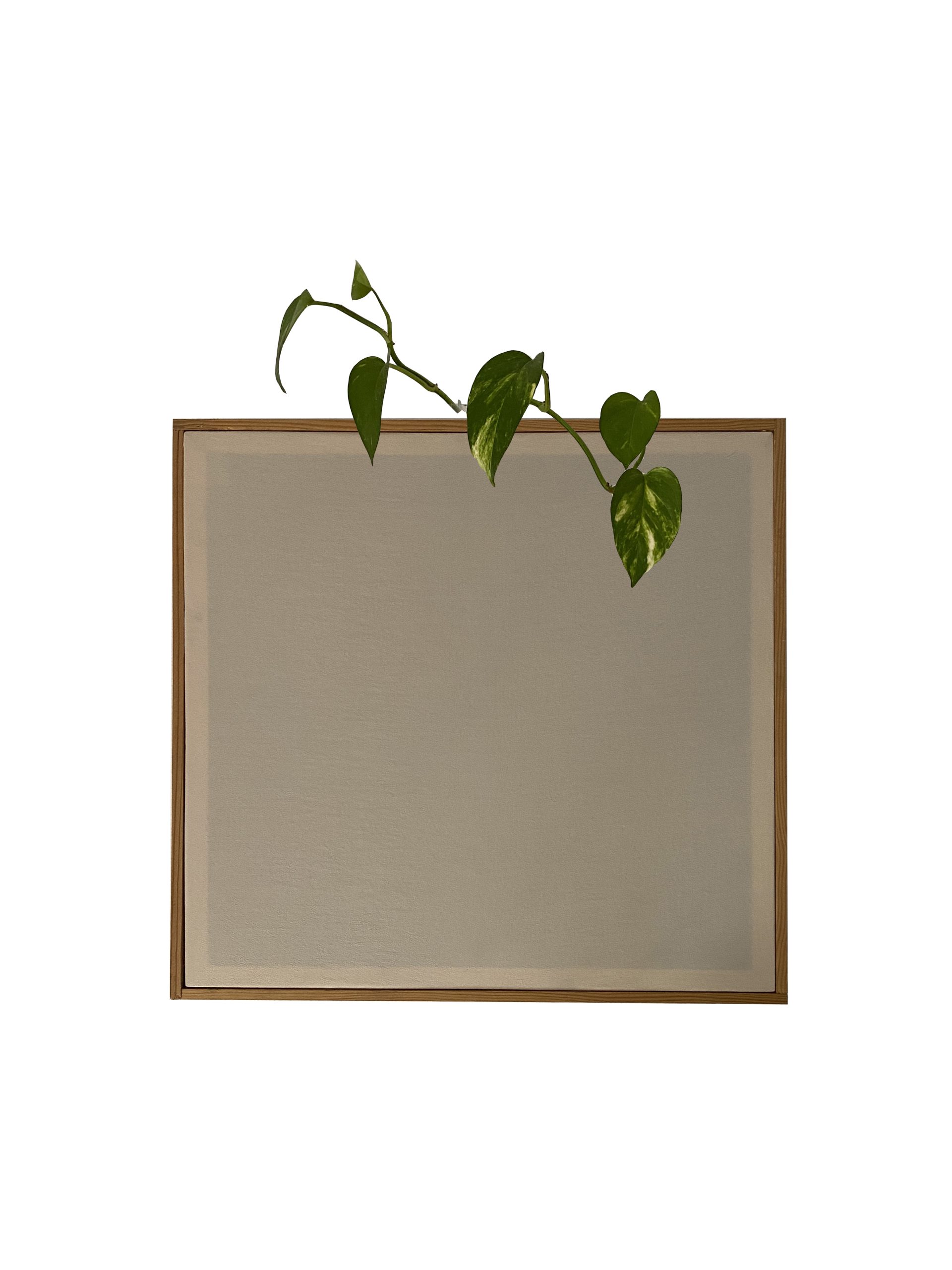 Panel acústico absorbente de 62cm con recipiente para planta, marco de madera visible y frente forrado de tela diseñado para reducir la reverberación.